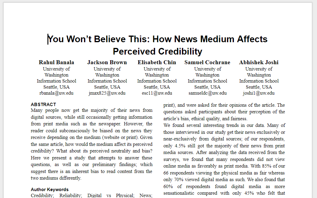 As a final project for INFO 470, Research Methods in Informatics, a team and I were tasked with conducting a real-world research project on a topic of our choosing. We chose to examine the perceived differences between print and digital news.